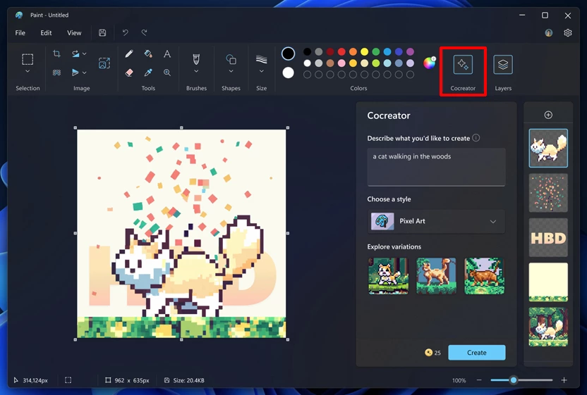 O Cocriador, um gerador de imagens baseado em inteligência artificial (IA), agora está disponível para todos os usuários do Microsoft Paint no Windows 11. Utilizando o modelo DALL-E 3 da OpenAI, o Cocriador permite a criação rápida e automática de imagens. Os usuários só precisam fornecer uma breve descrição e selecionar um estilo.